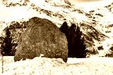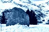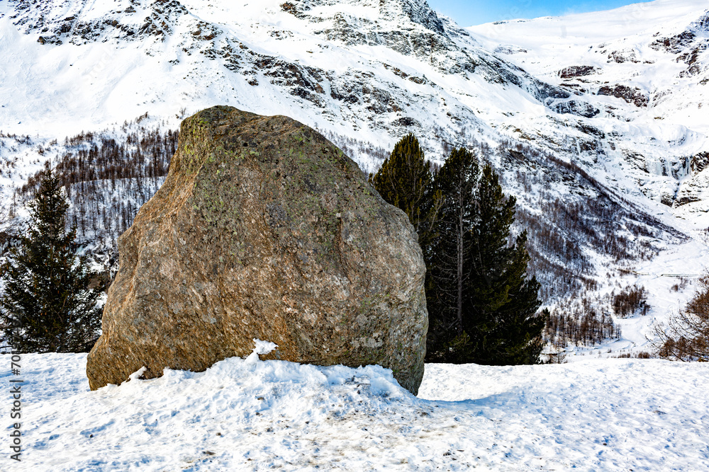 Stone monument on the mountains of Bernina express, stop station, the Diavolezza Glacier, Switzerland, Europe.