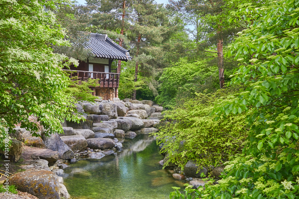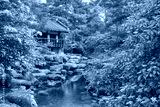 Idyllic little Japanese temple above a stream, in a park near Marzahn, Berlin, Germany.