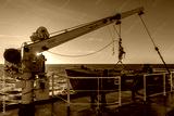 Orange rescue boat on big cargo vessel and crane. Man over board drill. Lifeboat training.