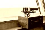 Nautical black sextant placed on wooden box in navigational bridge. Navigational equipment. Celestial navigation.