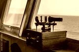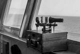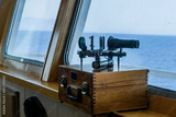 Nautical black sextant placed on wooden box in navigational bridge. Navigational equipment. Celestial navigation.