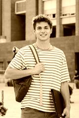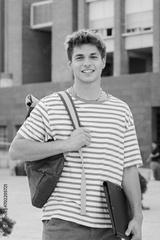 Vertical individual portrait of a handsome student young man standing at university campus. Happy teenage male smiling and looking at camera. Proud high school guy staring front carrying a backpack