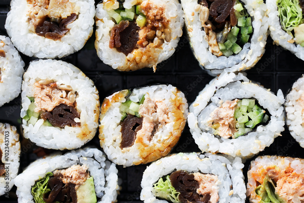 Takeaway sushi background. Uramaki California roll and futomaki. Japanese food isolated on black. Black sushi takeaway box closeup. Different various types of sushi. Lunch box texture.