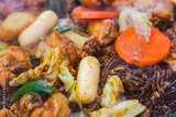 Jjimdak Korean Soy Braised Chicken. Popular Korean braised chicken originating in the city of Andong, Korea. Carrots, soy sauce, potatoes, tteok, cabbage and vermicelli.