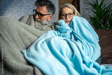 Dissatisfied husband and wife having problem with central heating, sitting on sofa at home, freezing. Freezing family warm blankets looking at camera while sitting on sofa in cold home