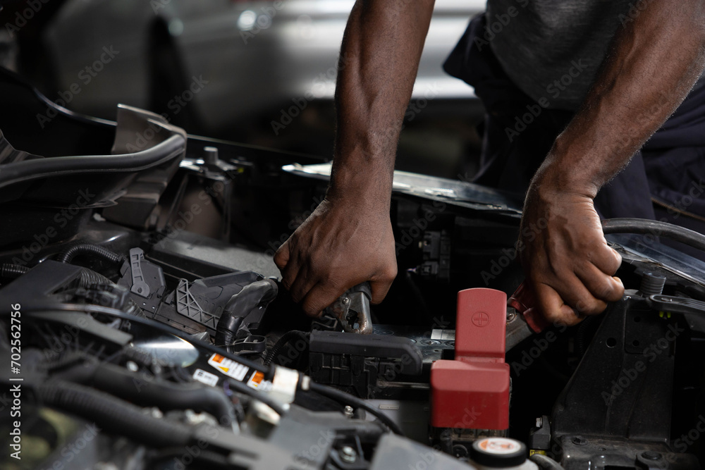 close up mechanic worker hands holding battery cable for jumping battery of a car in automobile repair shop