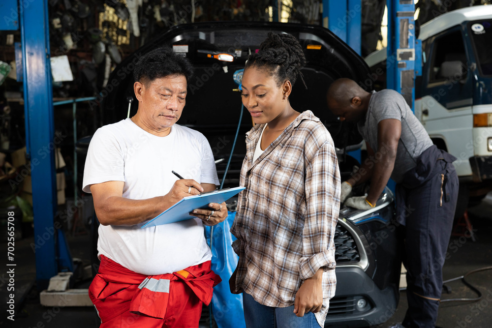 mechanic talking about how to fix a car to customer in automobile repair shop