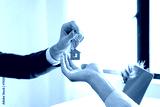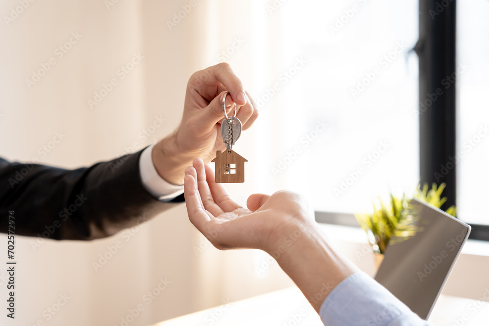 lease, rental and selling home. Real estate agent manager smile holding key for new owner. rent house, Sales, loan credit financial, insurance, Seller, dealer, installment, buy, sell, move in