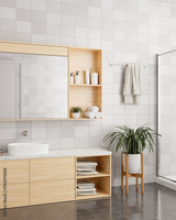 A modern, minimal bathroom with a minimal wooden vanity sink and a mirror with cabinet.