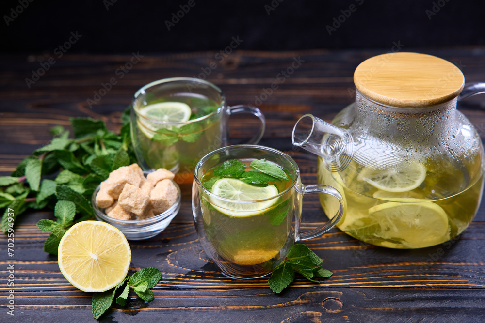 natural organic herbal tea with lemon and mint in glass teapot on a wooden table