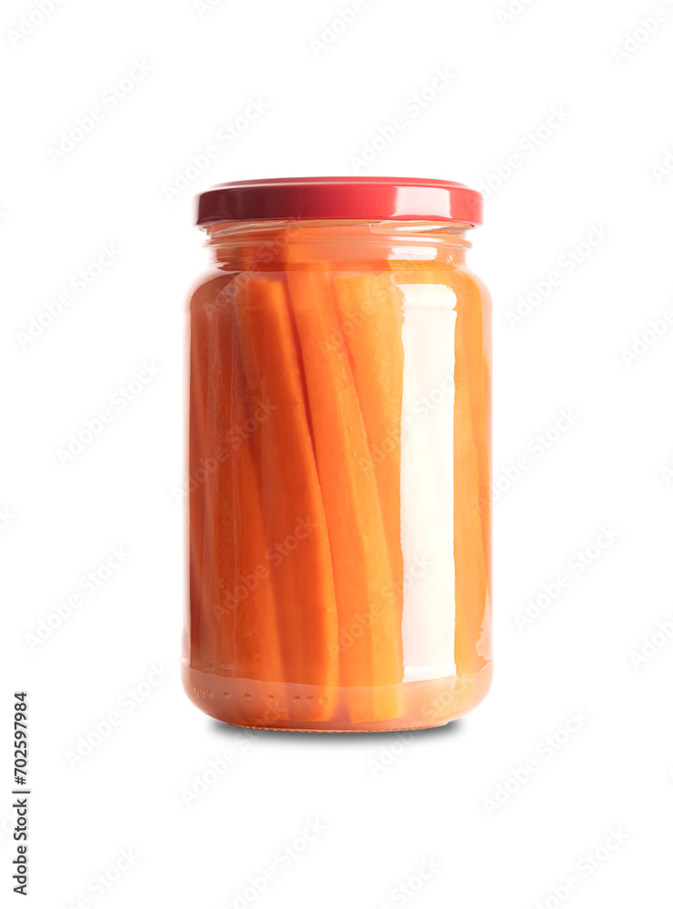 Carrot sticks, homemade fermented carrots, in glass jar with lid. Carrots cut into sticks, fermented by lactic acid bacteria. Unpasteurized and uncooked they provide probiotics and improve digestion.