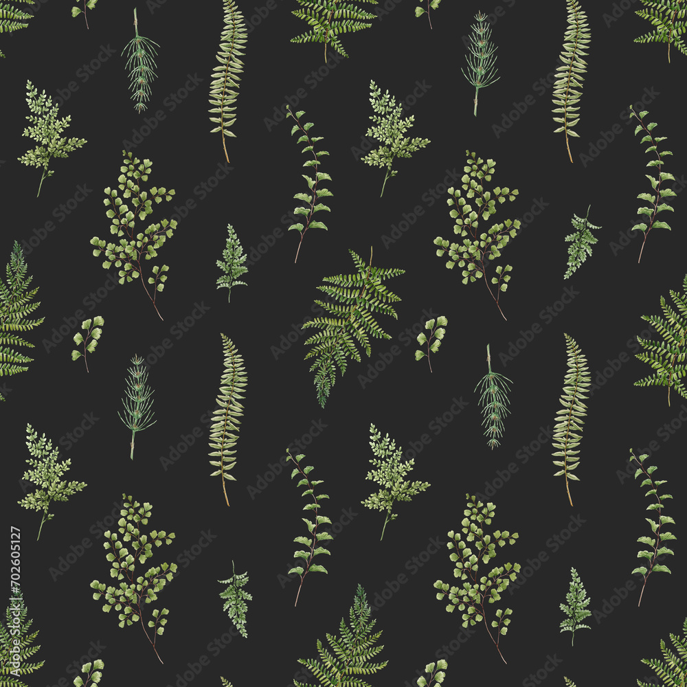 Beautiful seamless pattern with watercolor hand drawn forest plant leaves and flowers. Popular stock design. Textile print.