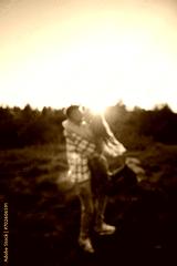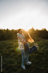 Blurred sunset scene. Young man spins woman walking spending time together in nature. Couple hugging and smiling in grass in field at sunset. Family holiday outdoor. Female embrace male in summer park