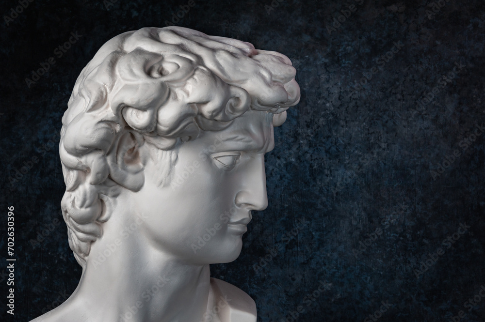 Gypsum copy of head statue David for artists on dark background. Replica of face famous sculpture youth of David by Michelangelo. Template design for art, dj, fashion, poster, zine. Renaissance epoch.