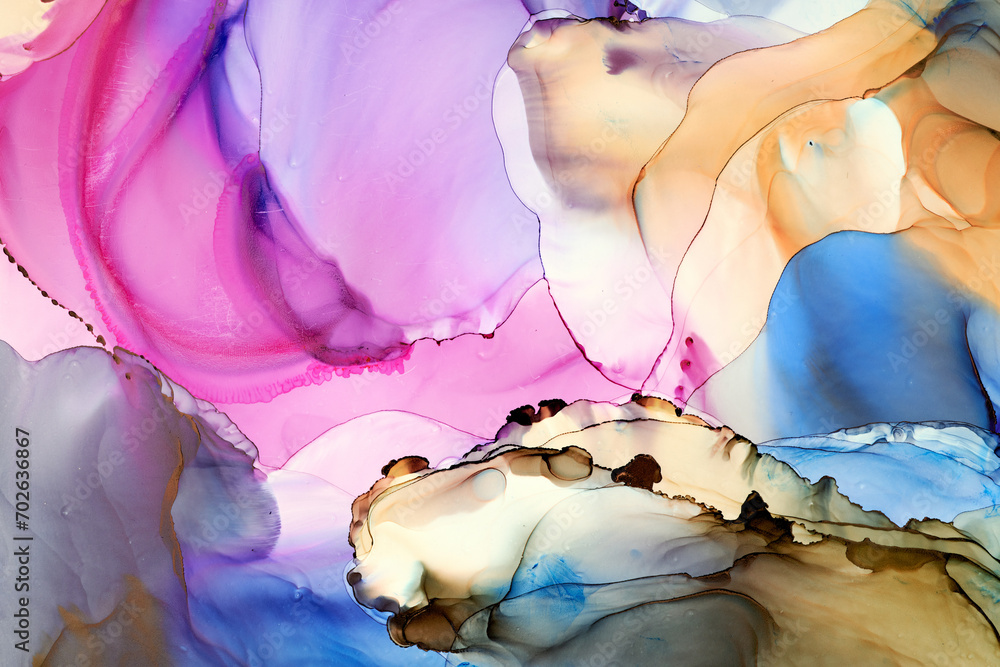 Natural luxury abstract fluid art painting in liquid ink technique. Tender and dreamy wallpaper. Mixture of colors creating transparent waves and golden swirls. For posters, other printed materials