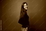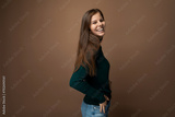 Cute brown-haired young woman wearing a green turtleneck