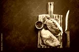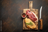 Two raw uncooked duck breast fillets with skin, seasoned with salt, pepper, rosemary top view on wooden cutting board with knife, dark brown concrete rustic background, space for text.