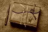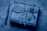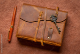 retro leather-bound journal with a decorative key and a luxurt pen on a handmade bark paper, journaling concept
