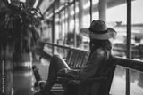 Woman enjoying waiting time in the airport while relaxing on a bench