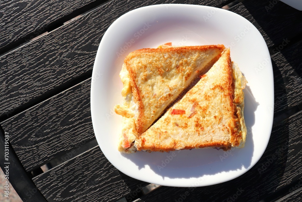 Street style masala bread omelet sandwich. Freshly cooked eggs with onion, tomatoes, and spices. Copy space. Healthy Morning breakfast ideas. Protein rich egg recipes.