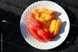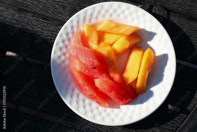 Beautiful sliced fruits in white plate on a wooden table. healthy fruit, watermelon, and papaya. copy space. Fruit plate. Fasting concept.