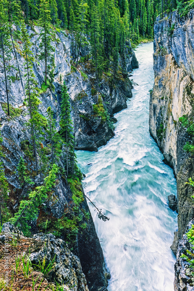 Deep canyon with a flowing river in the wilderness