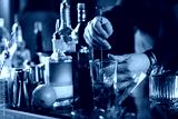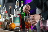Bartender mixing Negroni cocktail with long stirring metal spoon