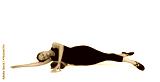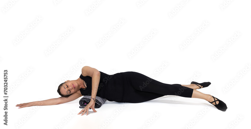inner thigh pose, in the studio isolated on white. Specialized trauma releasing exercises for elderly people, 55 years old woman trainer posing for exercises.