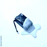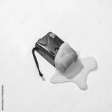 Creative minimalist layout. Camera with slime on a blue background. Surreal summer idea. Conceptual pop