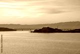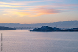 Dawn on the bay with islands, in the distance you can see the railway bridge. Stunning sunrise on the bay of the Kapchagai reservoir from the Kapchagaisoy hydroelectric power station.