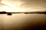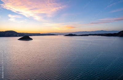 Dawn on the bay with islands, in the distance you can see the railway bridge. Stunning sunrise on the bay of the Kapchagai reservoir from the Kapchagaisoy hydroelectric power station.