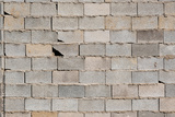 The texture of a brick wall with flaws. A gray wall of square cement blocks.