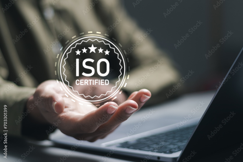 ISO standards quality control. Businessman use laptop with quality assurance with five stars or guarantee product. ISO Standard certification. Modern ISO banner.