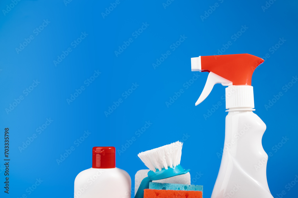Sanitary cleanup, white spray bottles, disinfectant, cleaning set