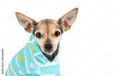 dog in winter clothes, pet in a warm sweater for walking on white background