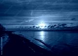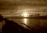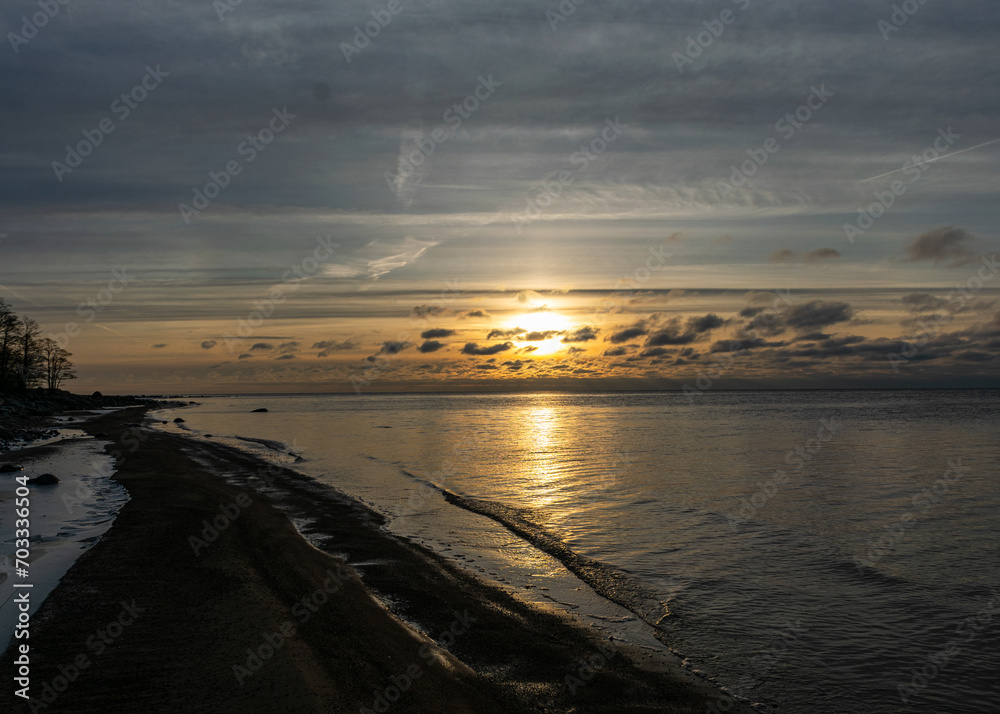 landscape with seashore, sunset by the sea, ice-covered beach on the seashore