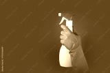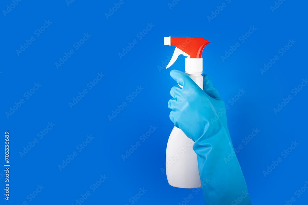 Disinfection service, liquid cleaner, spray bottle, cleanup tool, blue background, copy space