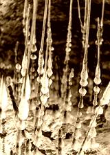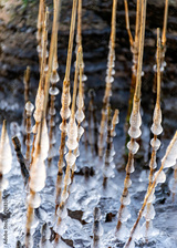 the seashore, rocky seashore, bare ice, blades of grass frozen with pieces of ice, natural formations