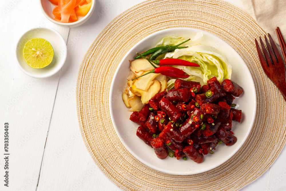 Thai Red Sausage Feast,fermented pork and rice sausage (Sai Krok Isan) in white plate with vegetables.Top view