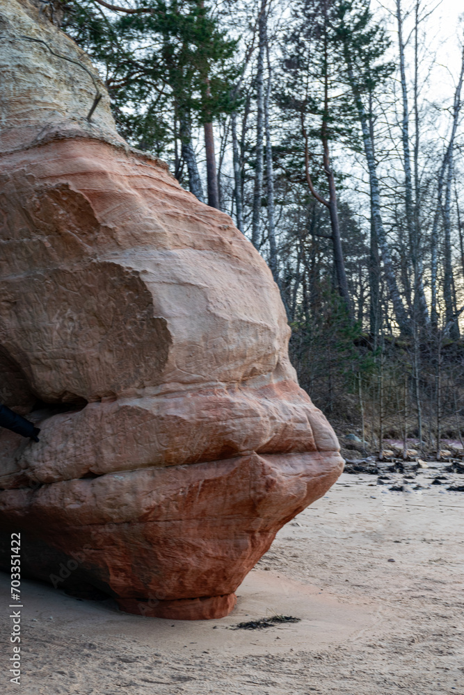 landscape with sandstone cliffs, bare ice, sand and ice formations, Veczemju cliffs, Latvia