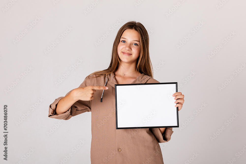 White banner .Teenager girl hold white blank paper. Young smiling woman show blank board. Close up female model portrait on white background.