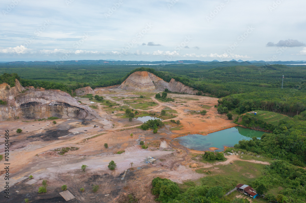 Aerial top view of ground in the land with sand in factory industry for construction site. Arid pattern texture background. Bulldozer tractor