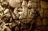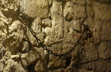 Slavery and bondage strong steel old shackles on stone wall in castle cellar or tomb