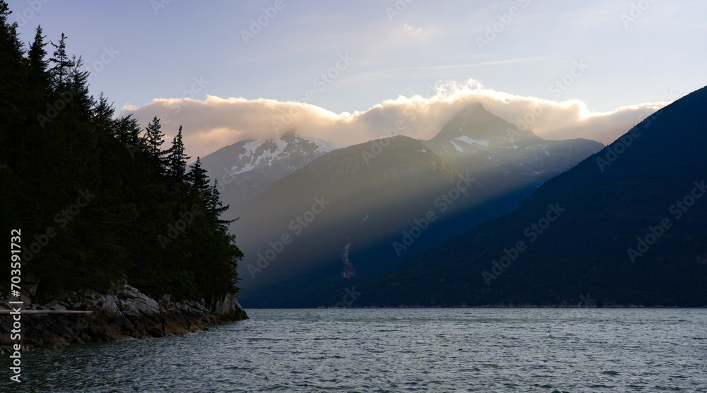 Rays of sunlight at sunset, piercing through the clouds over the waters of the Taiya Inlet in the Pacific Ocean near Skagway, Alaska