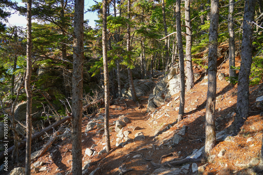 Pathway covered with pine needles in the forest of Yakutania Point near Skagway, Alaska