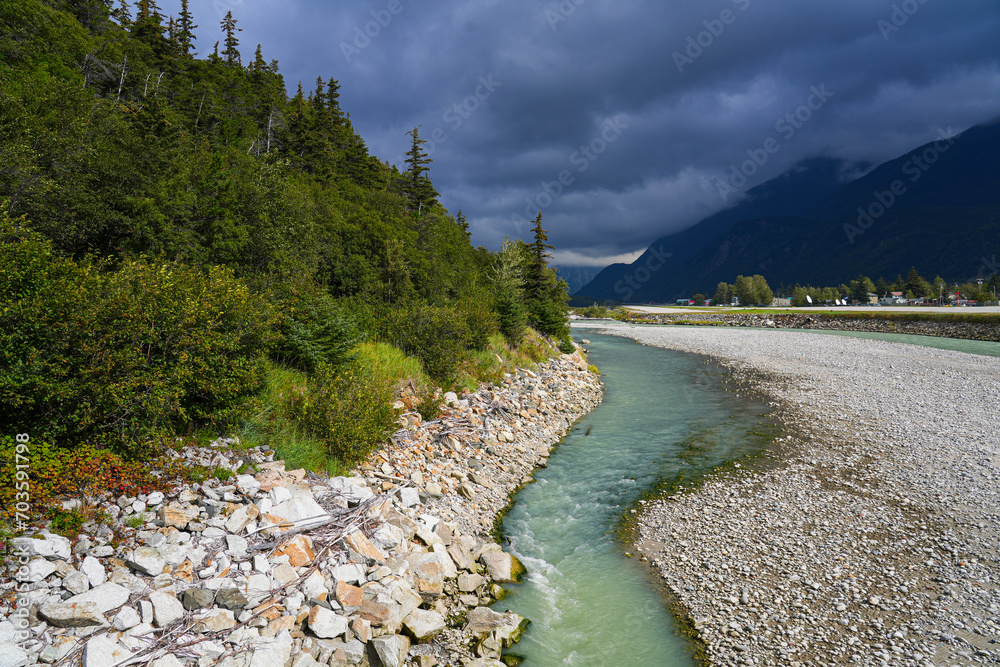 Skagway river flowing into a fjord of southeast Alaska surrounded by mountains covered with pine forests