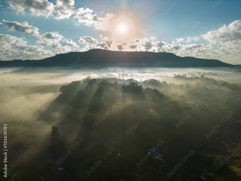 Aerial view of flowing fog waves on mountain tropical rainforest.Top view.
