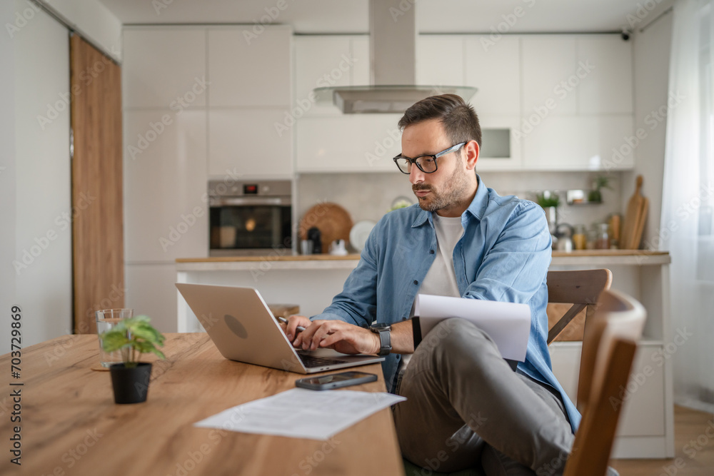 one man adult caucasian work on laptop at home happy smile