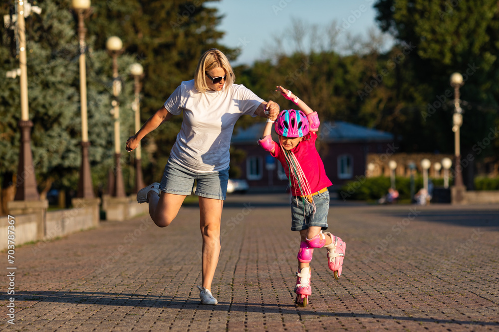 happy mother is teaching her little daughter to ride roller skates in summer park