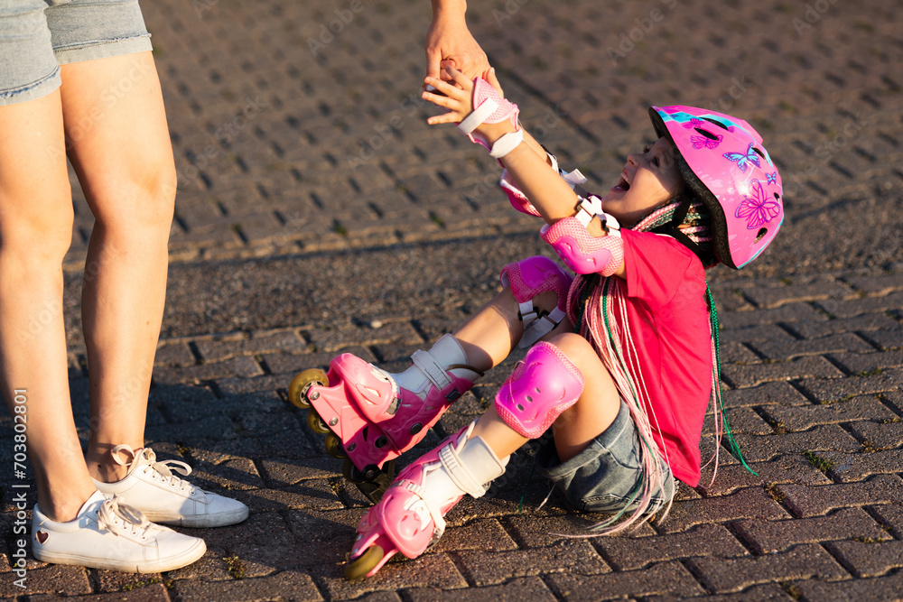 happy mother is teaching her little daughter to ride roller skates in summer park